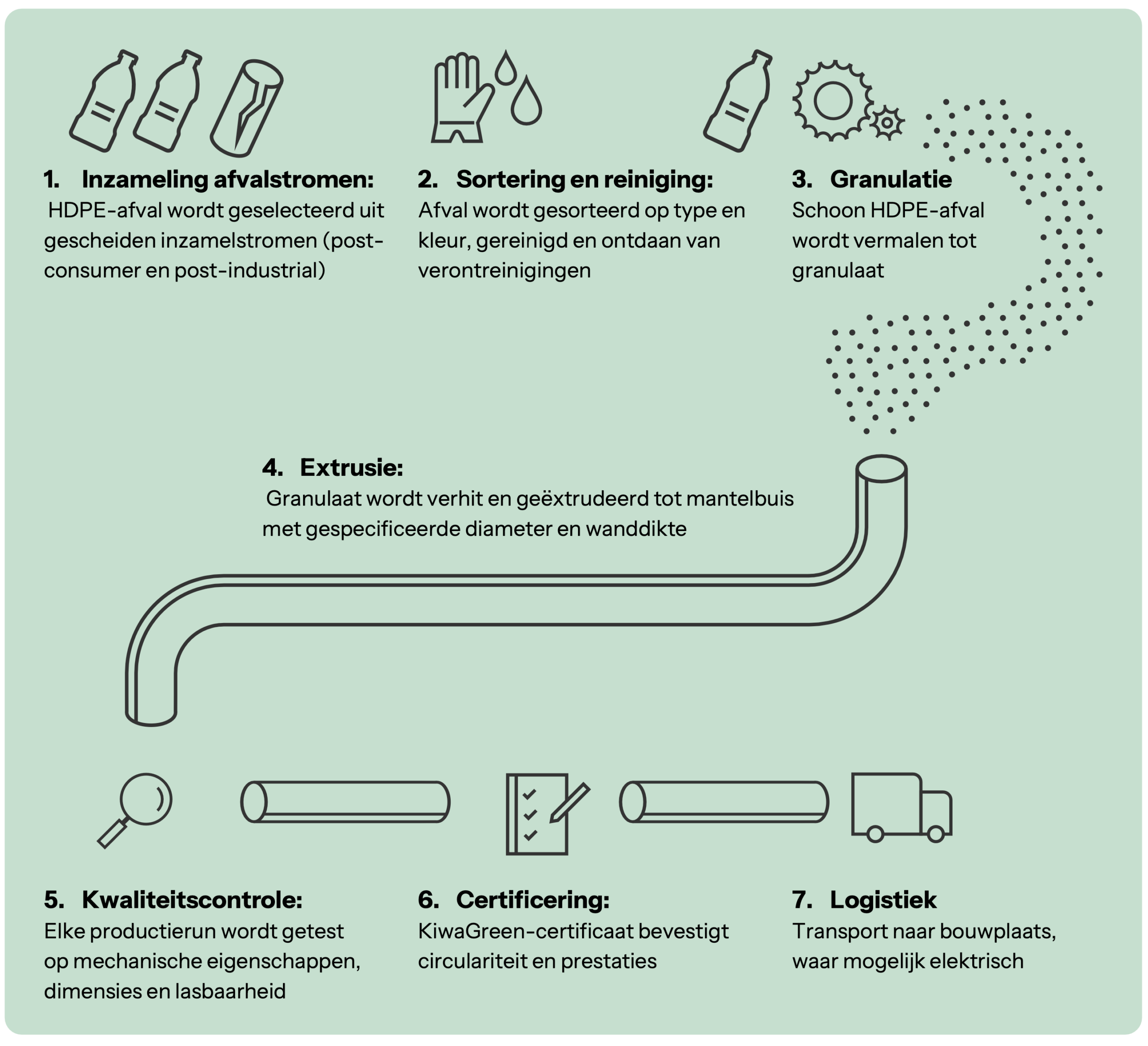 Wist je bijvoorbeeld dat er diverse PE-buiskwaliteiten bestaan? En dat jij een keuze hebt? Bij ons kun je kiezen uit de gebruikelijke PE-100 buis of wat denk je van een gerecyclede mantelbuis die juist geschikt is voor installatie in een open sleuf/ open ontgraving. Ook voor mantelbuizen voor een gestuurde boring bieden wij keuzemogelijkheden. Sinds begin 2023 beschikken wij over de fossielvrije Circulartube met KIWAGREEN keurmerk.